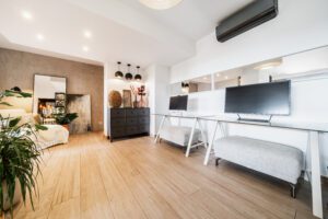 The interior features a spacious double-width living room with distinct zones tailored for both leisure and work. It includes a stylish sitting area, a TV wall, a fireplace, a 2-desk, work-from-home office, an additional sitting area, and a charming mini-wine cellar affectionately named “Tiny Winy.”