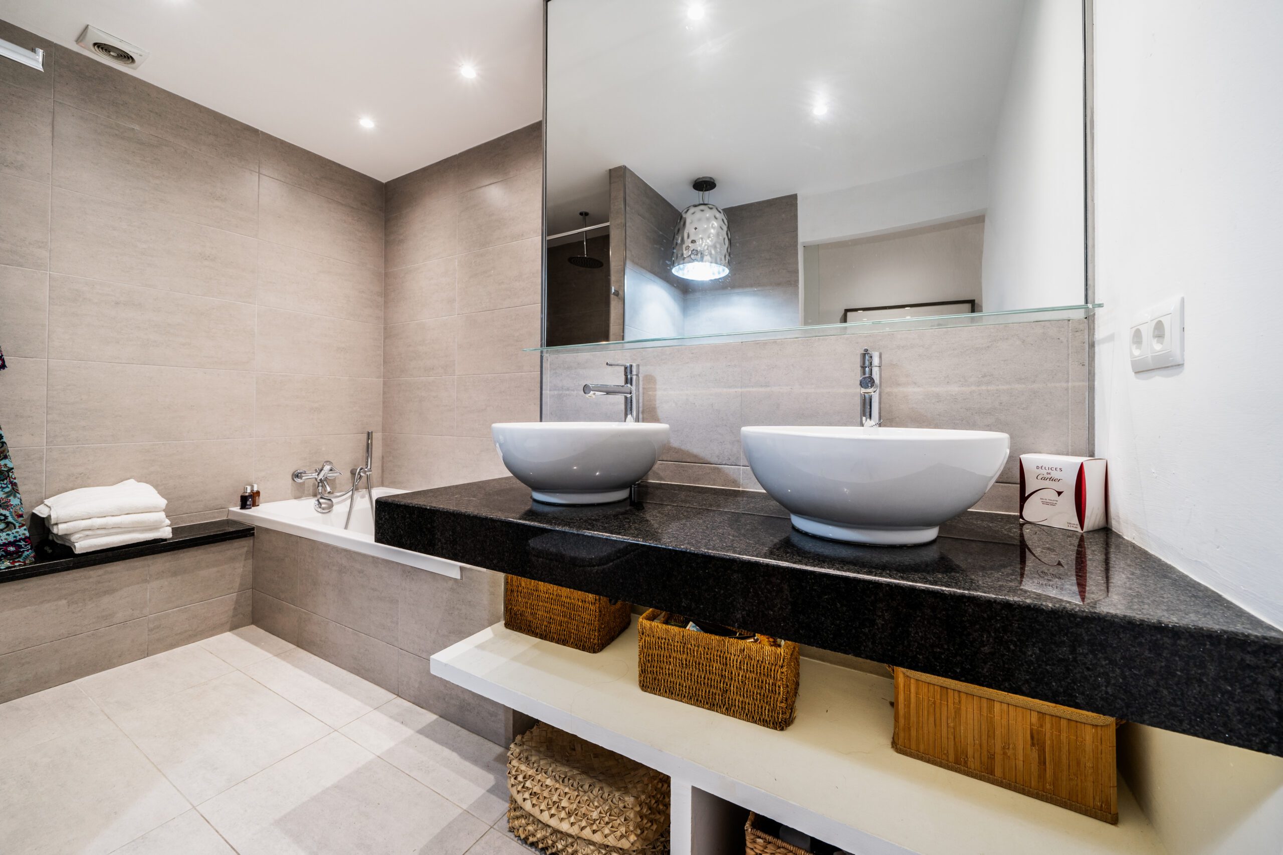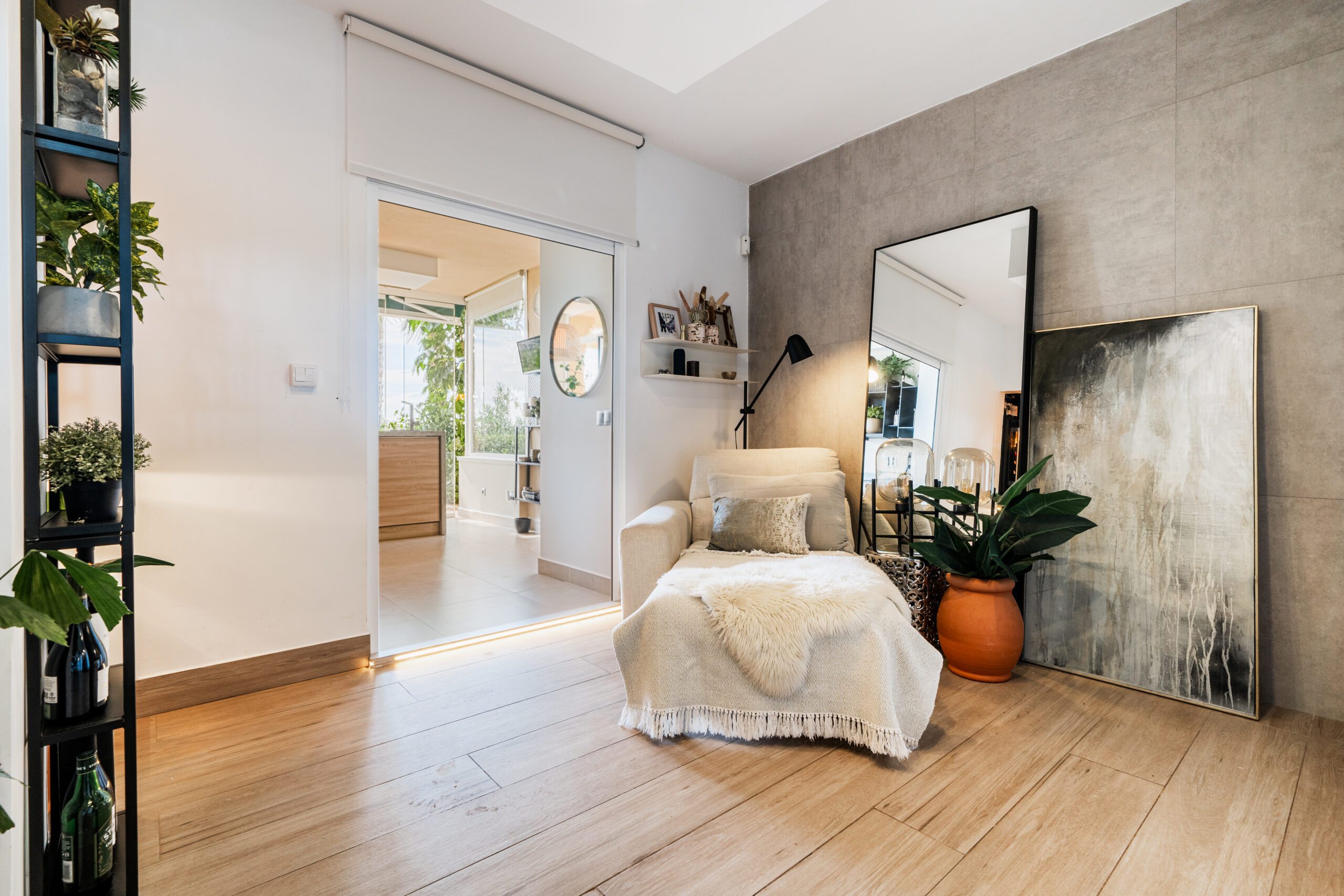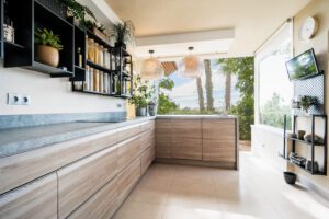 The interior features a spacious double-width living room with distinct zones tailored for both leisure and work. It includes a stylish sitting area, a TV wall, a fireplace, a 2-desk, work-from-home office, an additional sitting area, and a charming mini-wine cellar affectionately named “Tiny Winy.” The contemporary indoor/outdoor kitchen, surrounded by full-height glass curtains, extends to two separate dining areas and a spacious terrace seating area, creating the perfect setting for cooking and entertaining with guests. Unwind under a Bali-style gazebo housing a jacuzzi or enjoy the gardens surrounded with mature tropical plants. There are three double bedrooms, each with its own ensuite bathroom, plus the principal bedroom has a walk-in wardrobe. Throughout the space, all materials and furnishings have been tastefully selected, creating a comfortable and stylish home with modern amenities and a beautiful ambiance. Centred within a gated community, , This stunning apartment is perfect as a permanent home, holiday retreat, or a lucrative rental investment.
