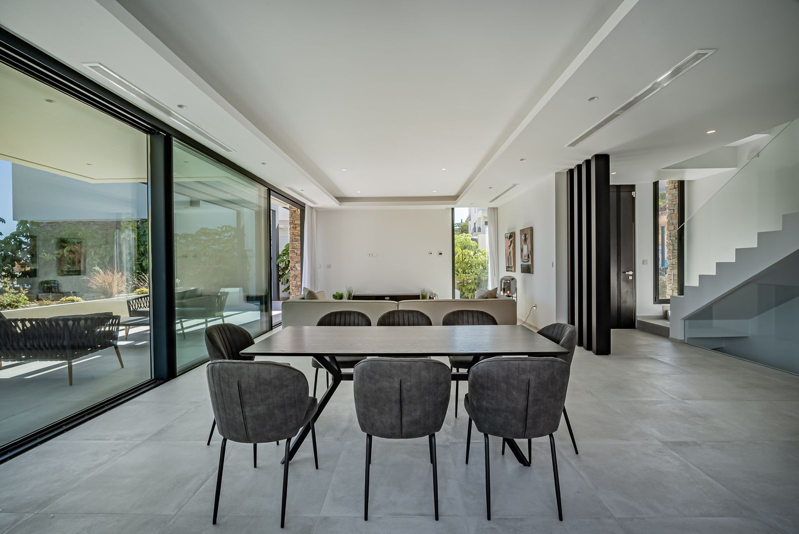 The interior of the villa includes a large dining area and integrated kitchen fitted with high-end appliances.