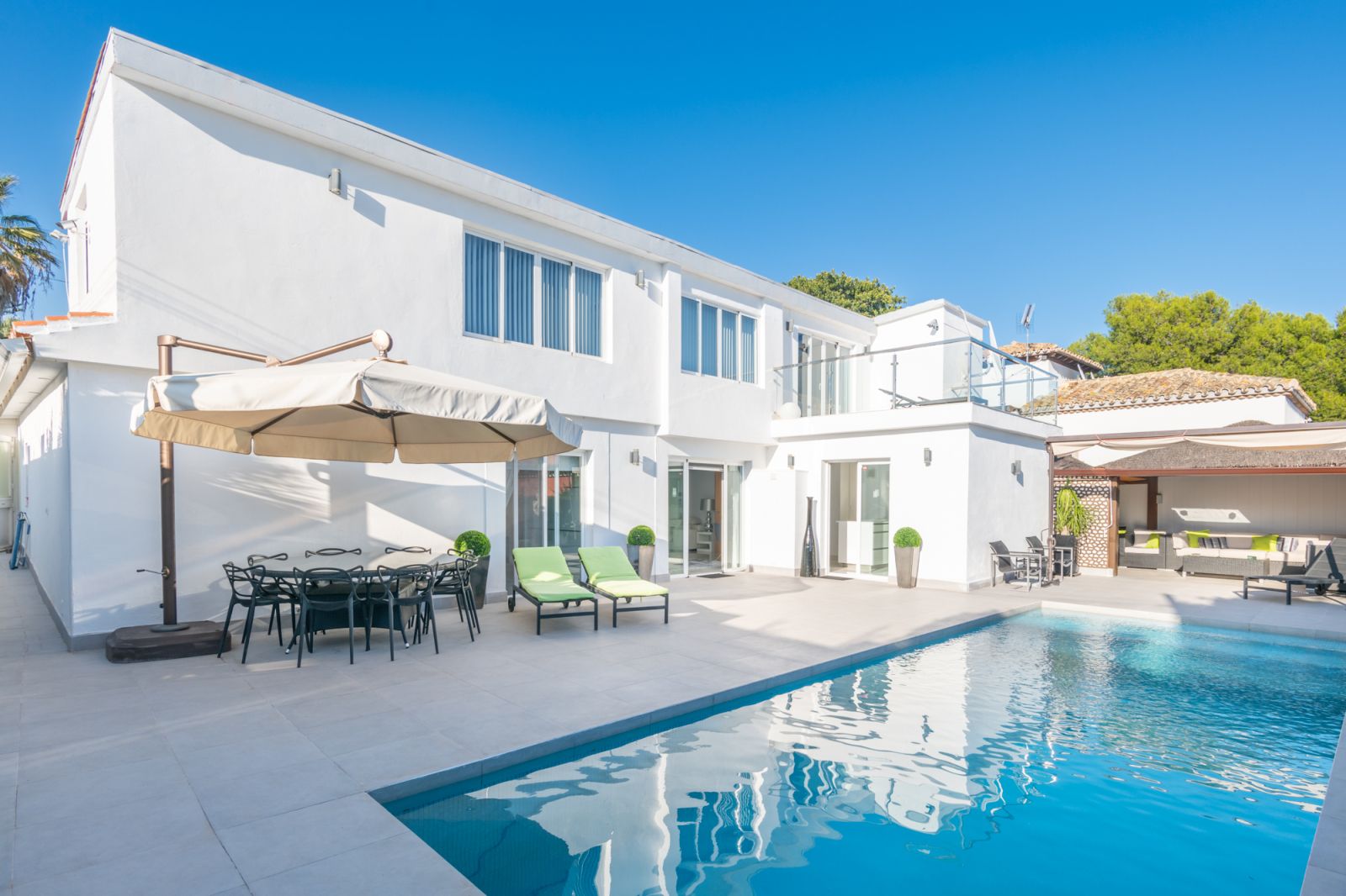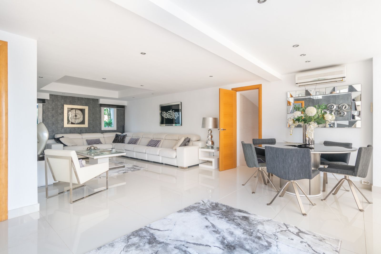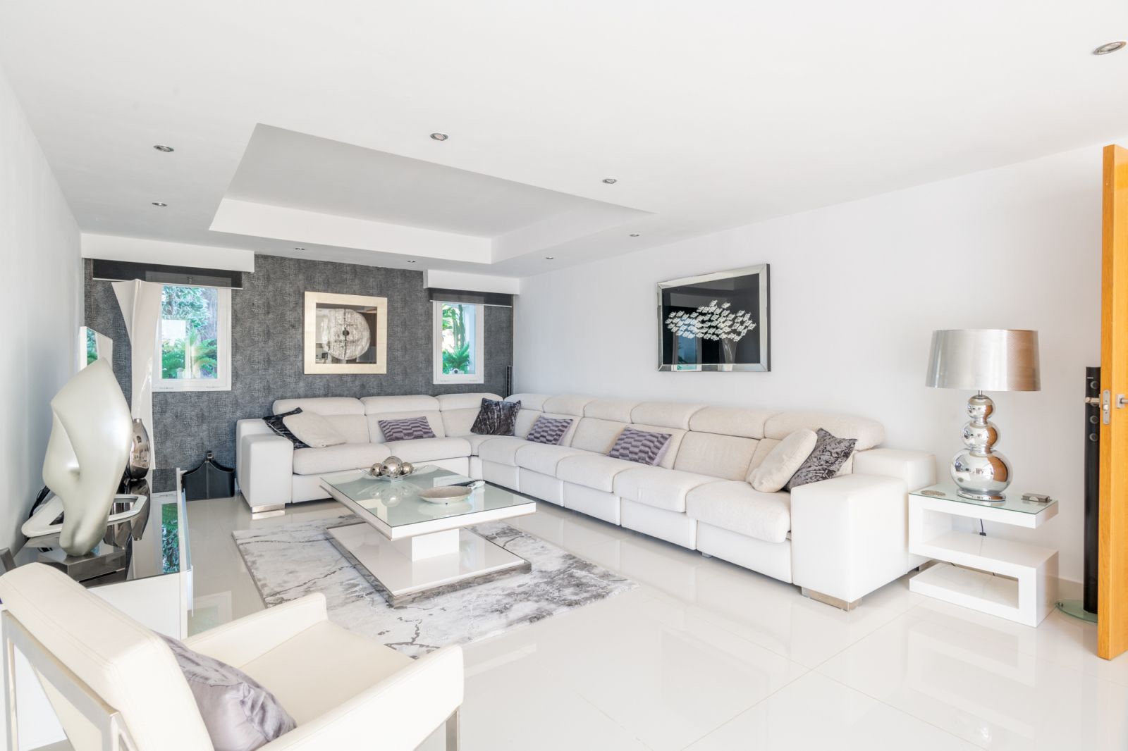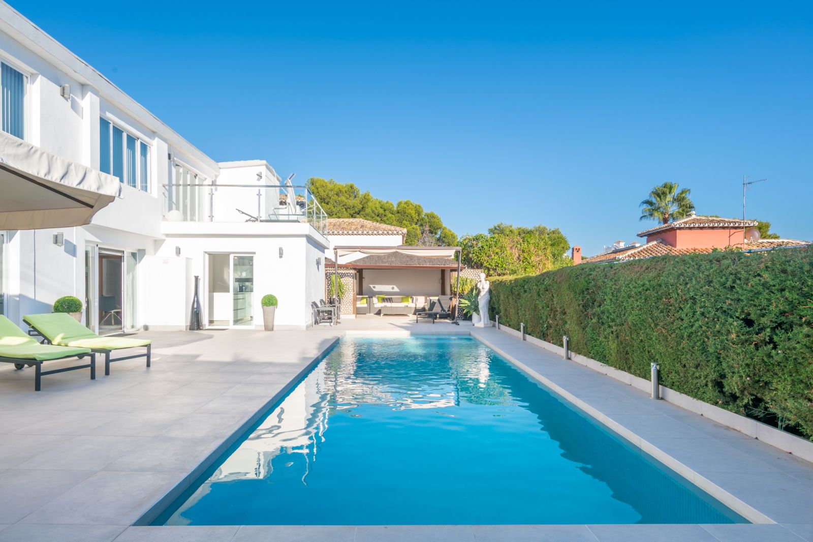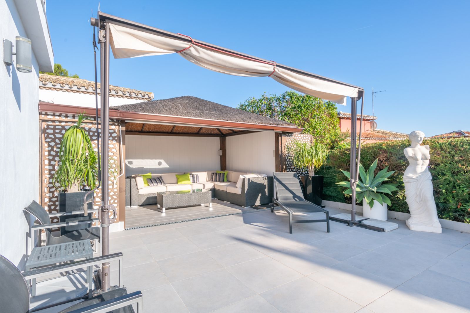 Stunning 4 bed villa in the popular area of Nueva Andalucia. It has been newly refurbished and has a bright and modern feel. The ground floor has an open plan living-room and kitchen area which leads through to manicured garden and private pool, large bedroom with en-suite, a further guest bedroom and guest toilet. A third bedroom with ensuite sits on the lower ground floor. The upper floor of the villa has another living area and large master bedroom with en-suite bathroom. The beautiful cabana and barbecue area on the large terrace outside make it perfect for entertaining friends and family....