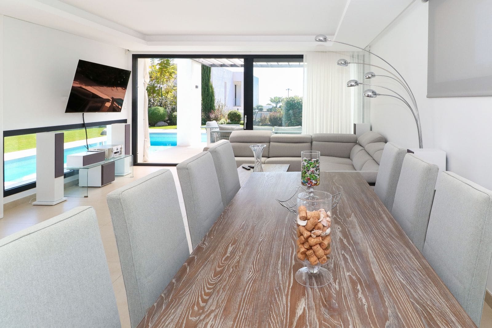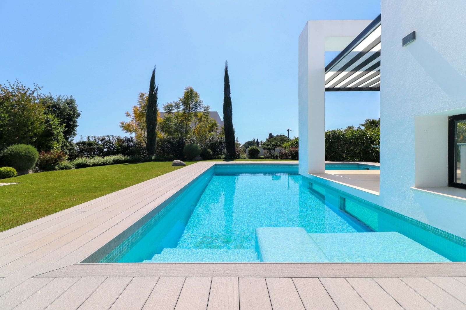Contemporary 4 bedroom villa, stylishly designed and highly energy efficient. The ground floor has a spacious living room with an open kitchen, two bedrooms and access to the terrace, garden and swimming pool. On the second floor, is a large master bedroom with a dressing room opening out to a covered terrace overlooking the sea. Downstairs there is another bedroom with a bathroom, a large storage room and a huge chill-out area with a breakfast bar, home theatre and access to the garden, with barbecue area. The house has underfloor heating, air conditioning, and an alarm system An extra special feature is a scandinavian style sauna , which is perfect for use in the winter months....