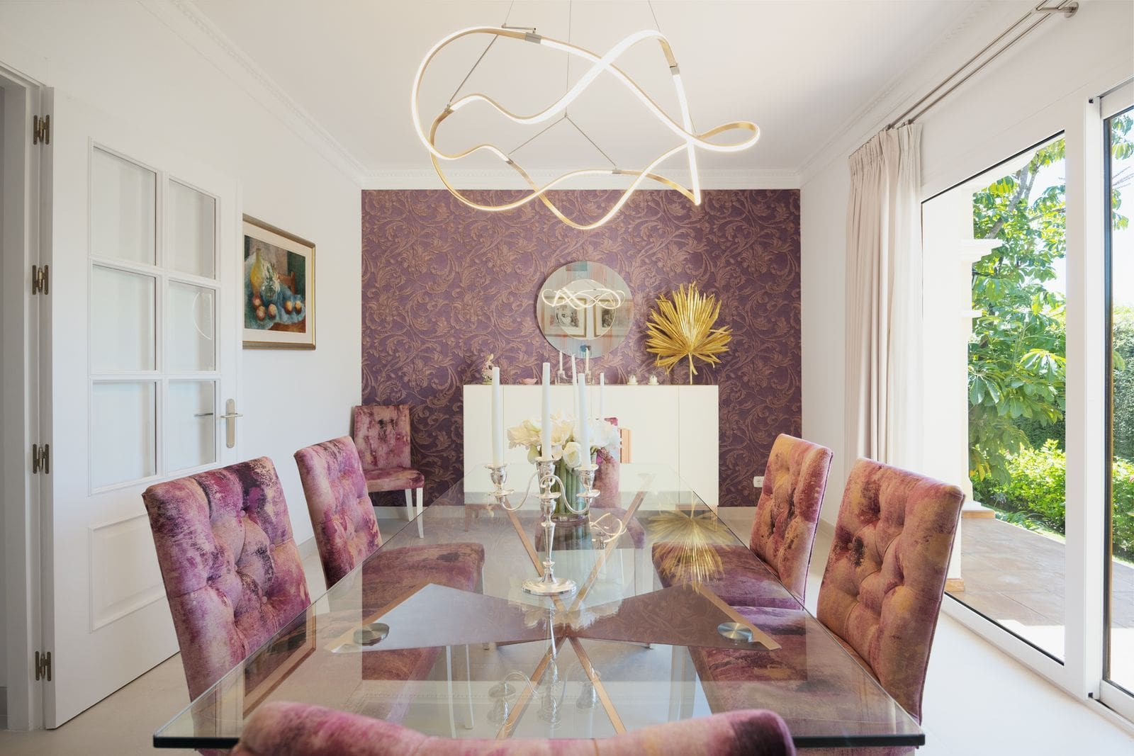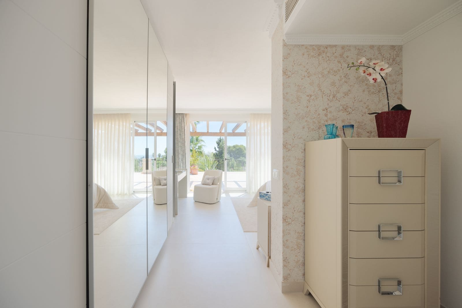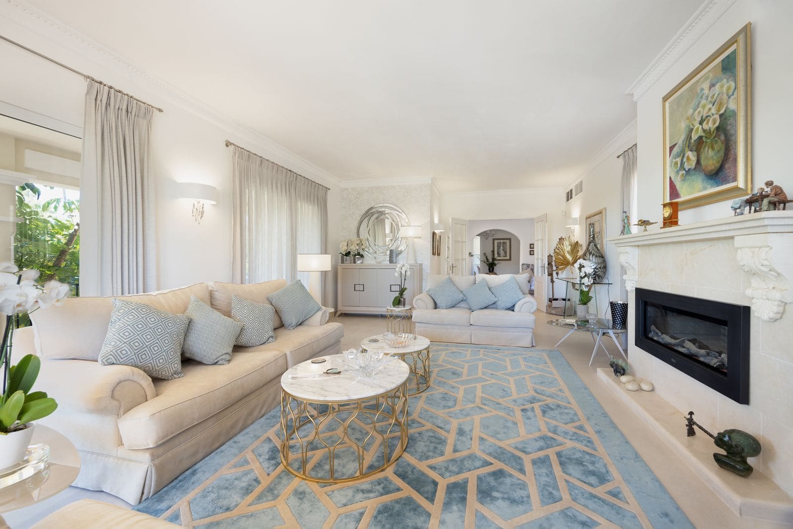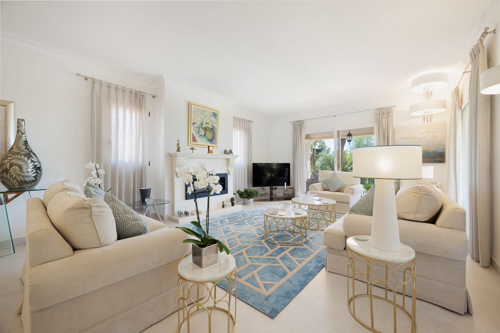 The ground floor entrance hall leads to a spacious living room which opens out to an extensive terrace area encompassing the entire front of the villa.