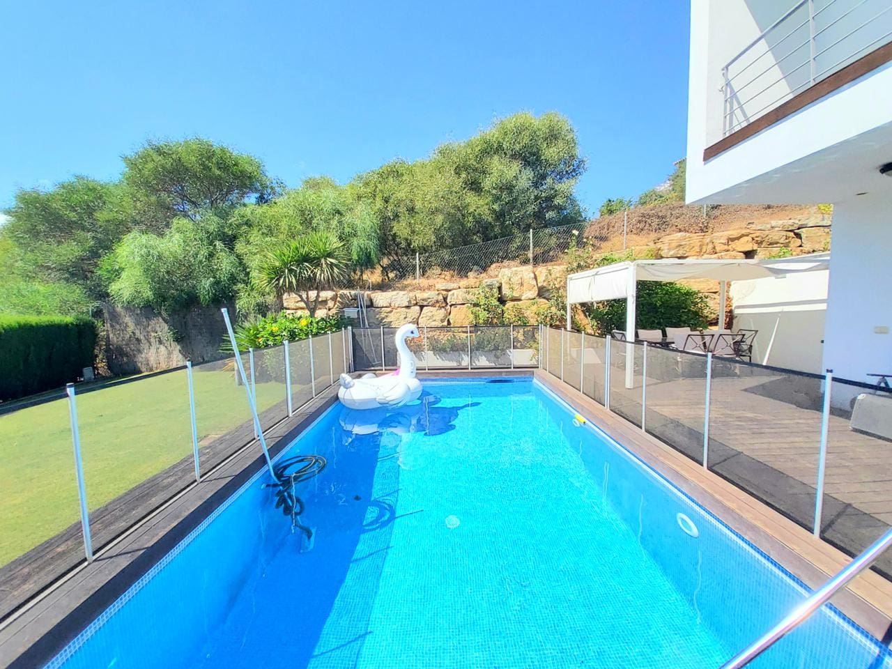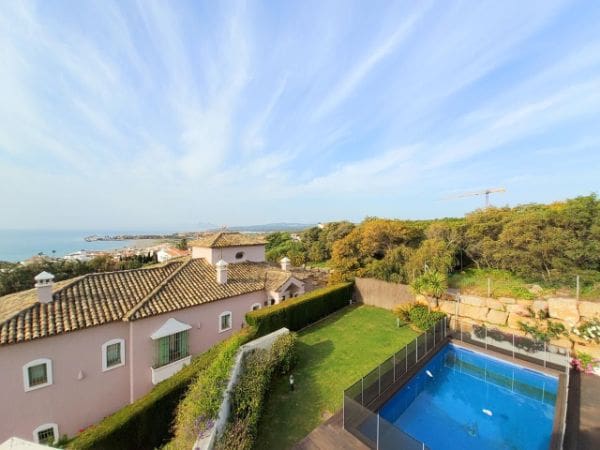 Modern 5 bedroom villa, built in an elevated position, with superb sea views. It is also situated minutes from the beach and the beautiful puerto of Sotogrande. The ground floor area includes: a modern fully fitted kitchen, large double bedroom, bathroom and a light and airy open plan living room with fireplace. The living room opens out onto the beautiful terrace with spectacular sea views and also gives access to swimming pool. The first floor includes, 3 bedrooms and 2 bathrooms (1 of them en suite), laundry room and 2 terraces, one of them covered. The basement includes a further bedroom and bathroom and a double garage. The property includes air conditioning and heating and most rooms have electronic security shutters. It also has a mature garden with beautiful olive trees....