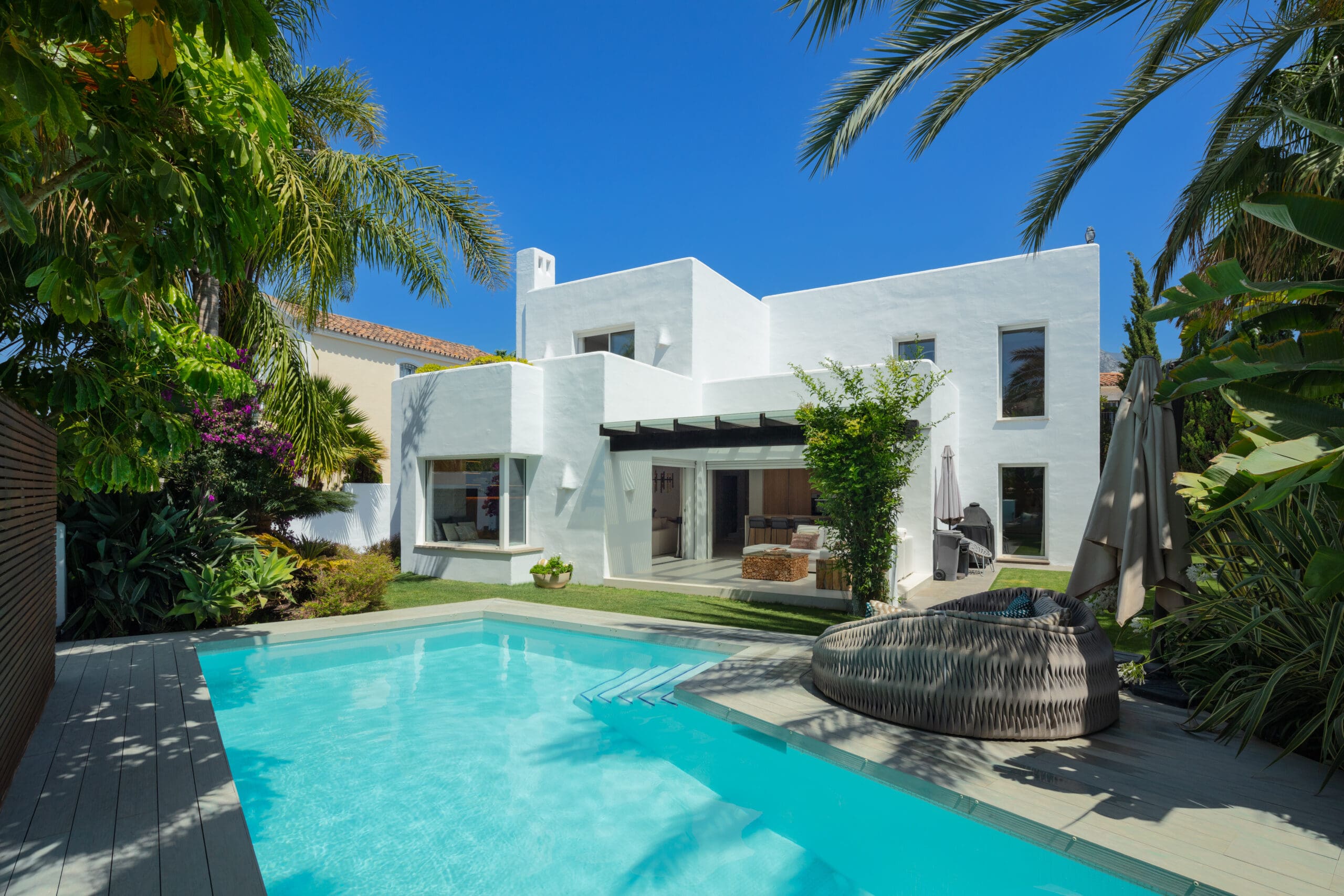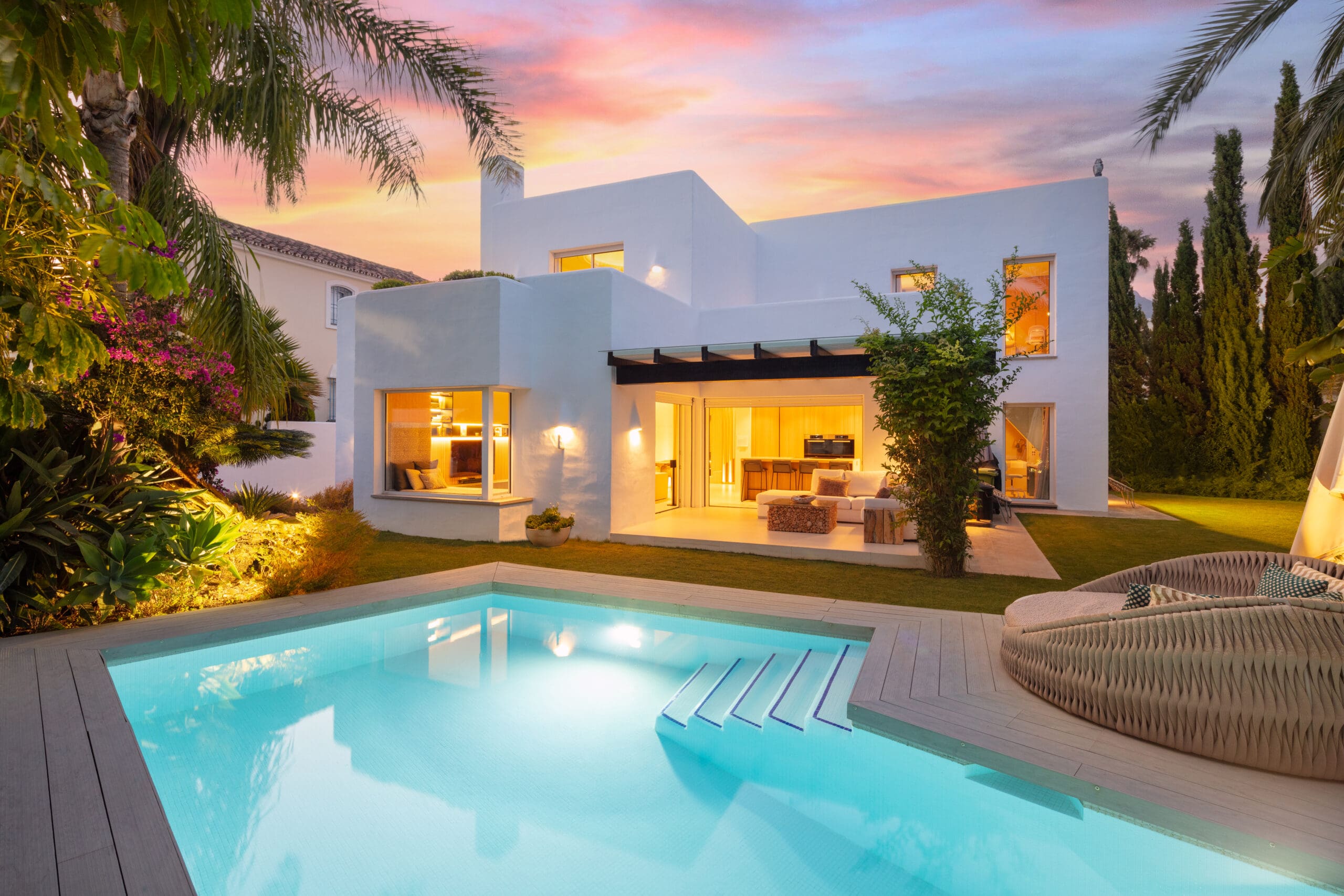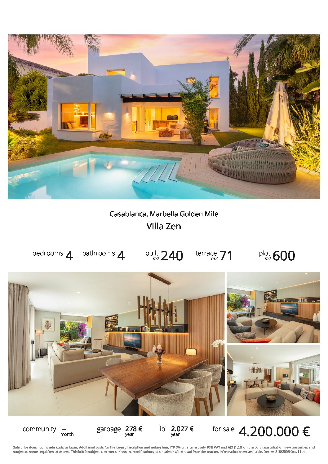 Stylish detached villa located in the prestigious neighbourhood "Casablanca" on the Golden Mile in Marbella . It is only minutes away from the Golden Mile Boardwalk. This exclusive area hosts a varie3ty of luxury amenities such as 5 star hotels, designer boutiques, fine dining restuarants and entertaining beach clubs...