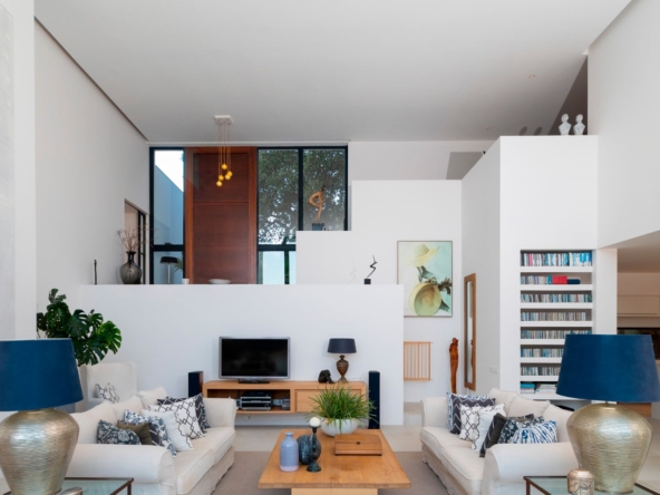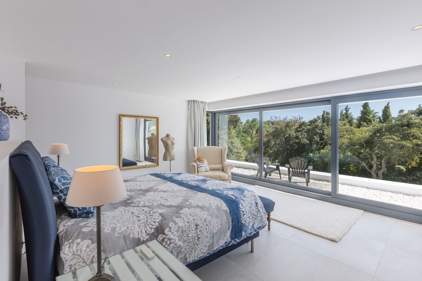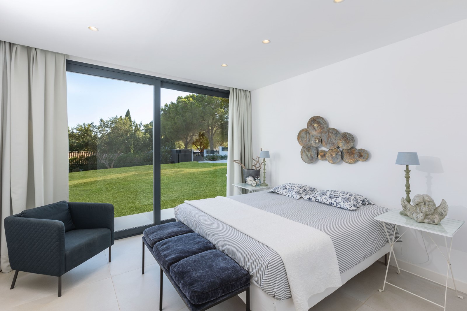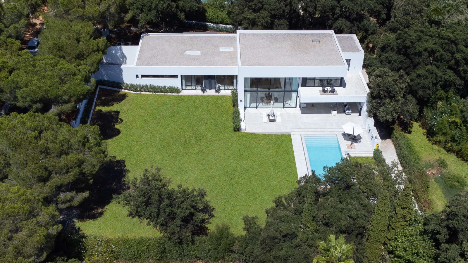 Spectacular modern villa for sale in a prime area of  Sotogrande.  It is situated in a quiet cul de sac and in a large plot of 2045 m . Its superbly manicured  garden also has beautiful cork trees and a private infinity pool. Key features of this stunning  villa are high ceilings and  floor to ceiling windows  which allow plenty of light and give the villa a  bright and airy feel .  One  of the villa sections includes three double bedrooms with ensuite bathrooms and in the other section an upper level  with impressive  open plan office , spacious  master bedroom,  large walk in closet and luxurious spa  bathroom, complete with stand alone bath  and rain shower. In addition the villa has a  beautiful living area , including contemporary kitchen, dining area and utility room. Key external features  include terraces both covered and uncovered, dining and  barbecue area , large well maintained garden and luxurious  saltwater infinity pool. Other state of the art additions include partial aerothermal underfloor heating and cooling system, indirect lighting, highly insulating windows, electric curtains, an anti-kalk filter system throughout, an Alarm video system, and a spacious underground basement area .