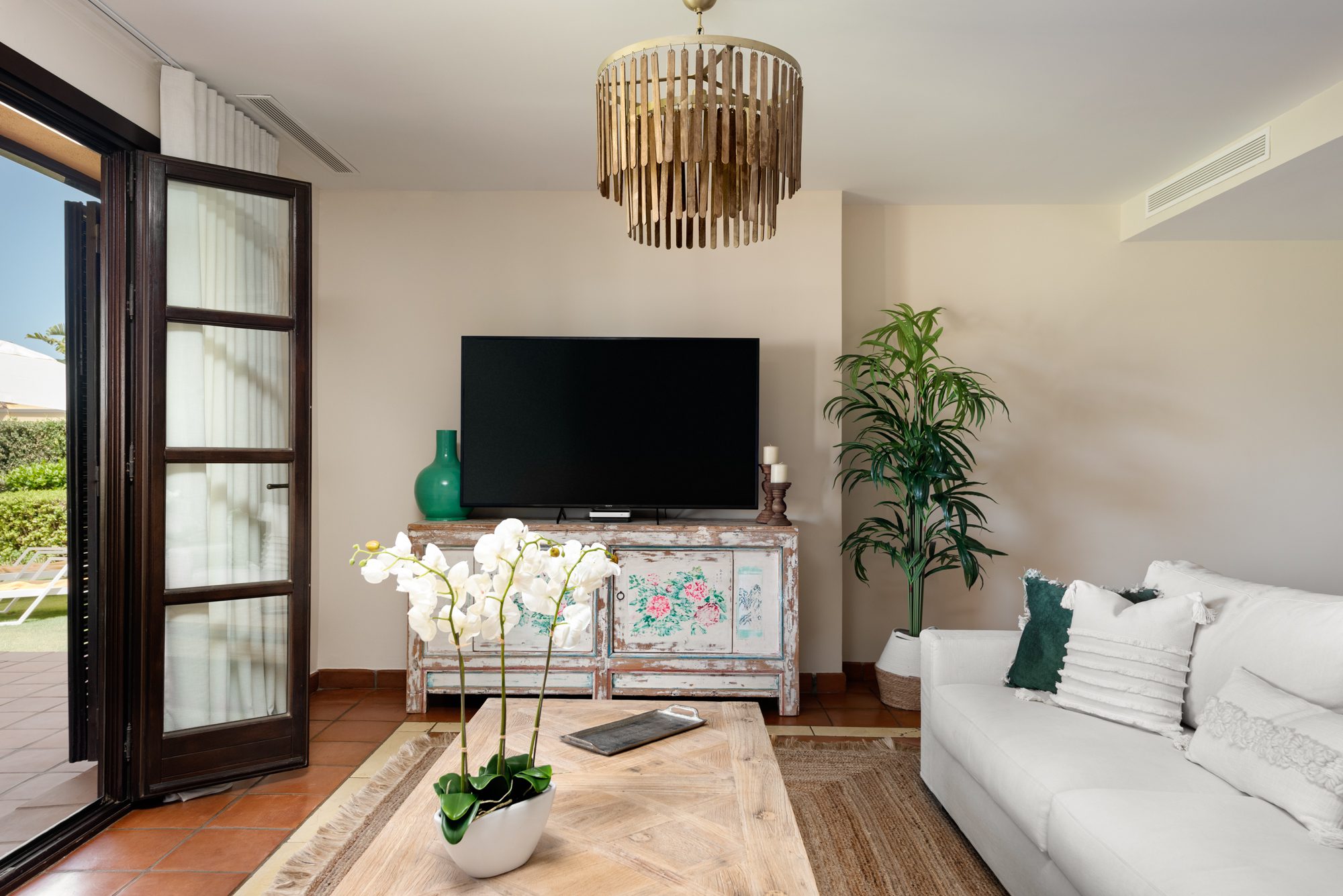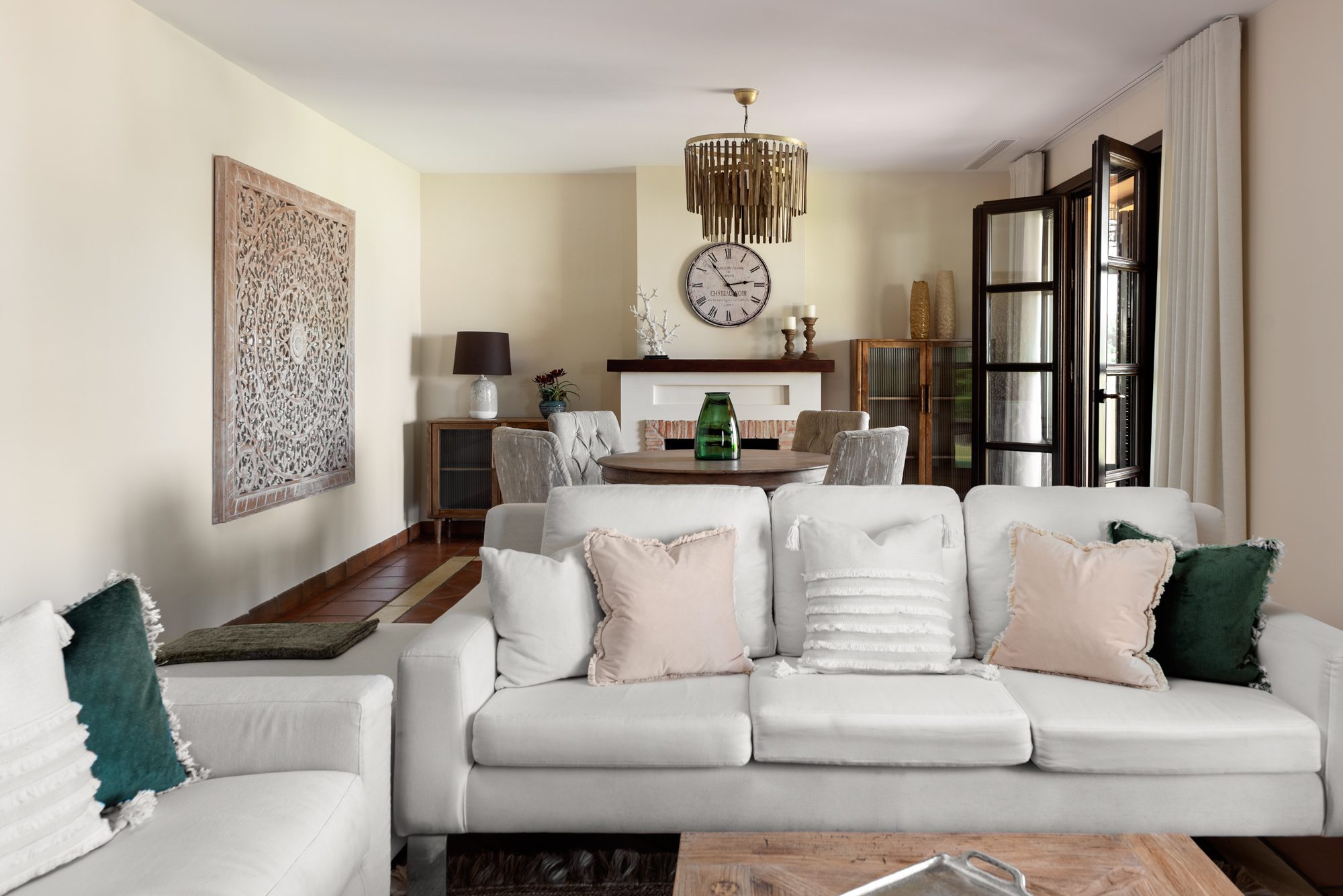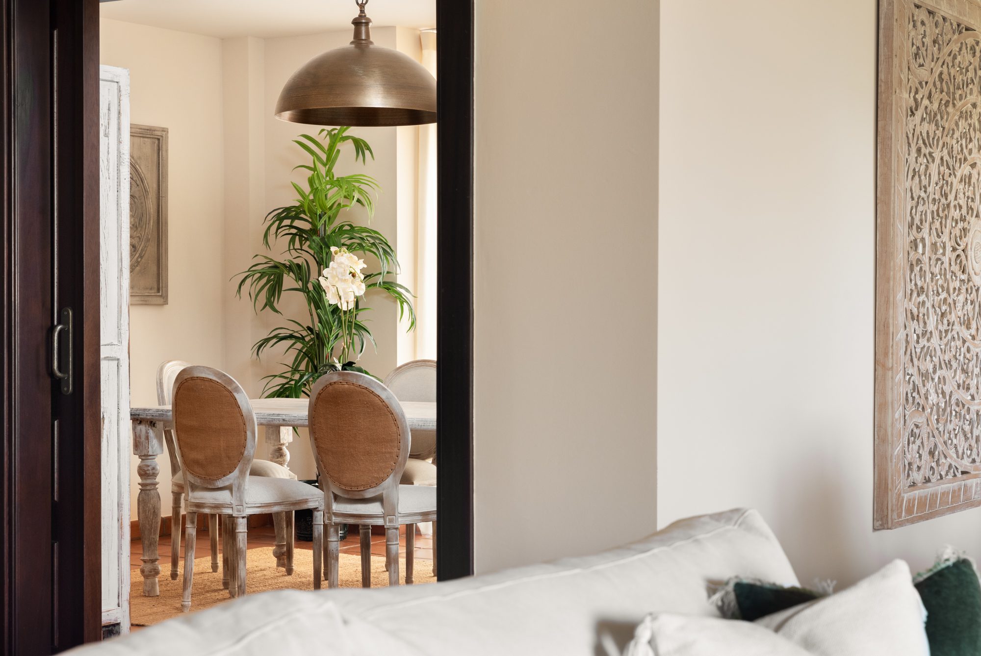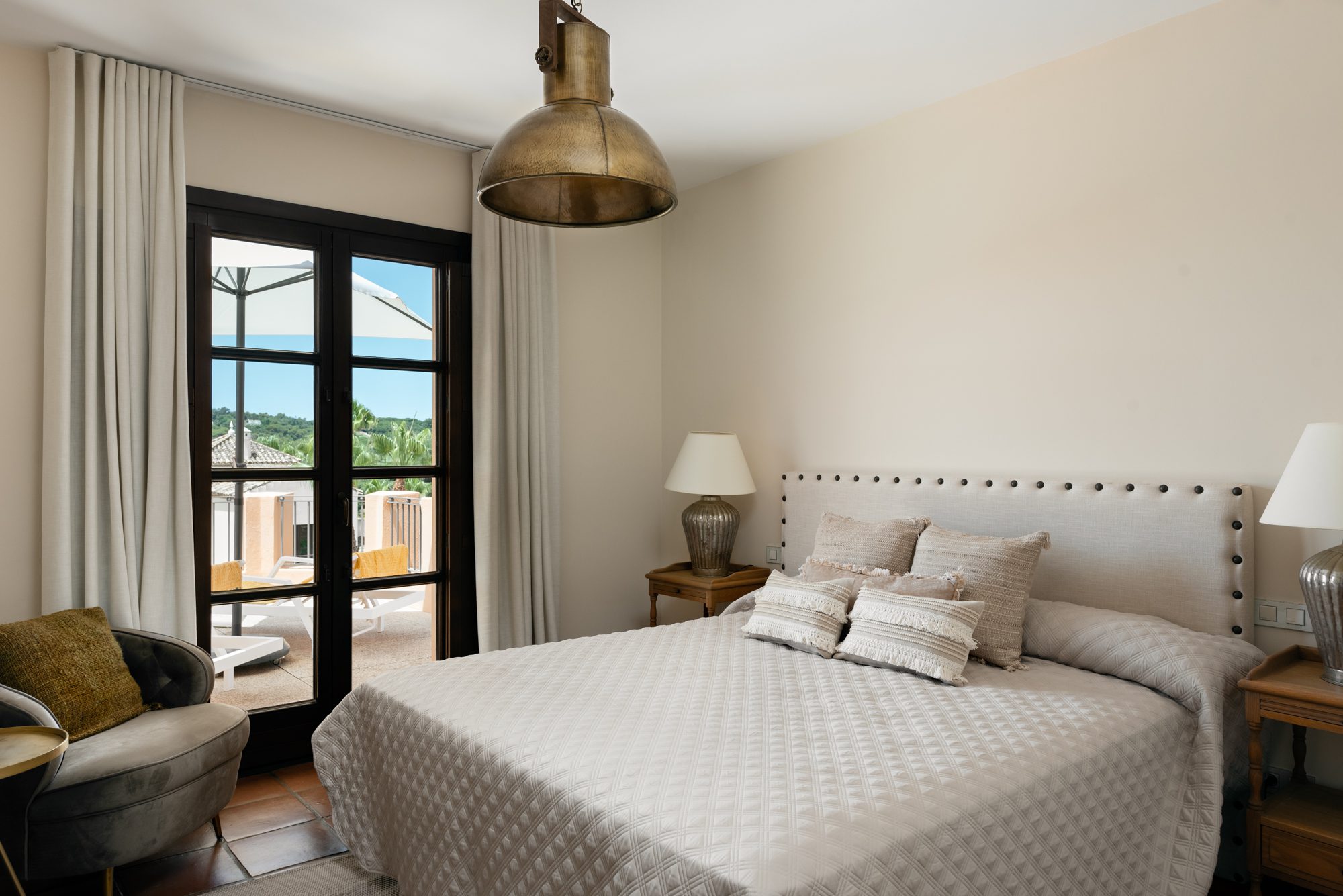 Superb Andalusian-style Villa is located in Los Cortijos de la Reserva, Sotogrande. The house is built on two levels, the ground floor consists of a modern fitted kitchen with a separate utility room, an open light-flooded living and dining area with an open fireplace, a guest bedroom with a bathroom ensuite, and a guest toilet. The living and dining room is leading to a spacious covered terrace and a private south-facing garden from where you can enjoy beautiful views. On the first floor are two more bedrooms that are sharing one bathroom, the master suite with a dressing room, a bathroom ensuite, and a large terrace. Other Features: Underfloor heating throughout, air conditioning, alarm system and private garage. The furniture is included in the price