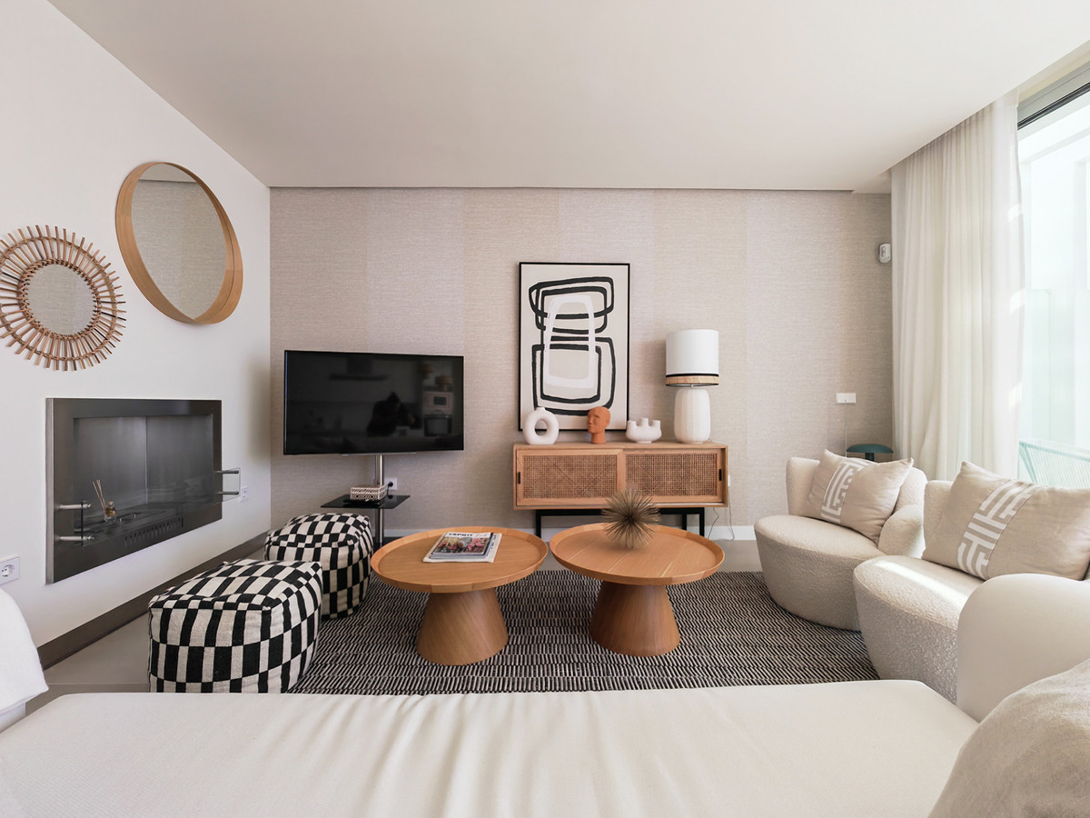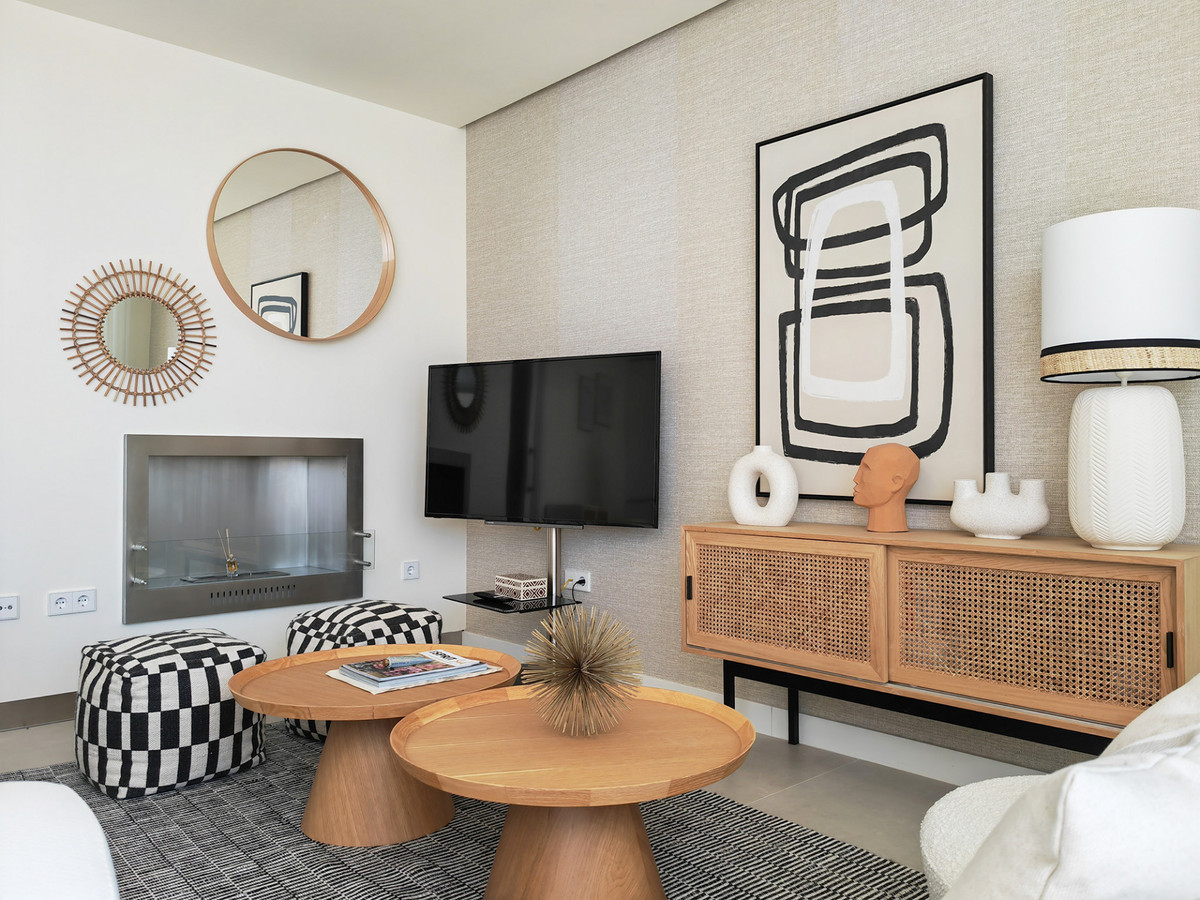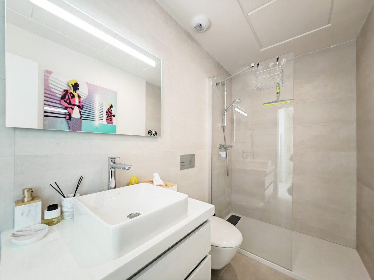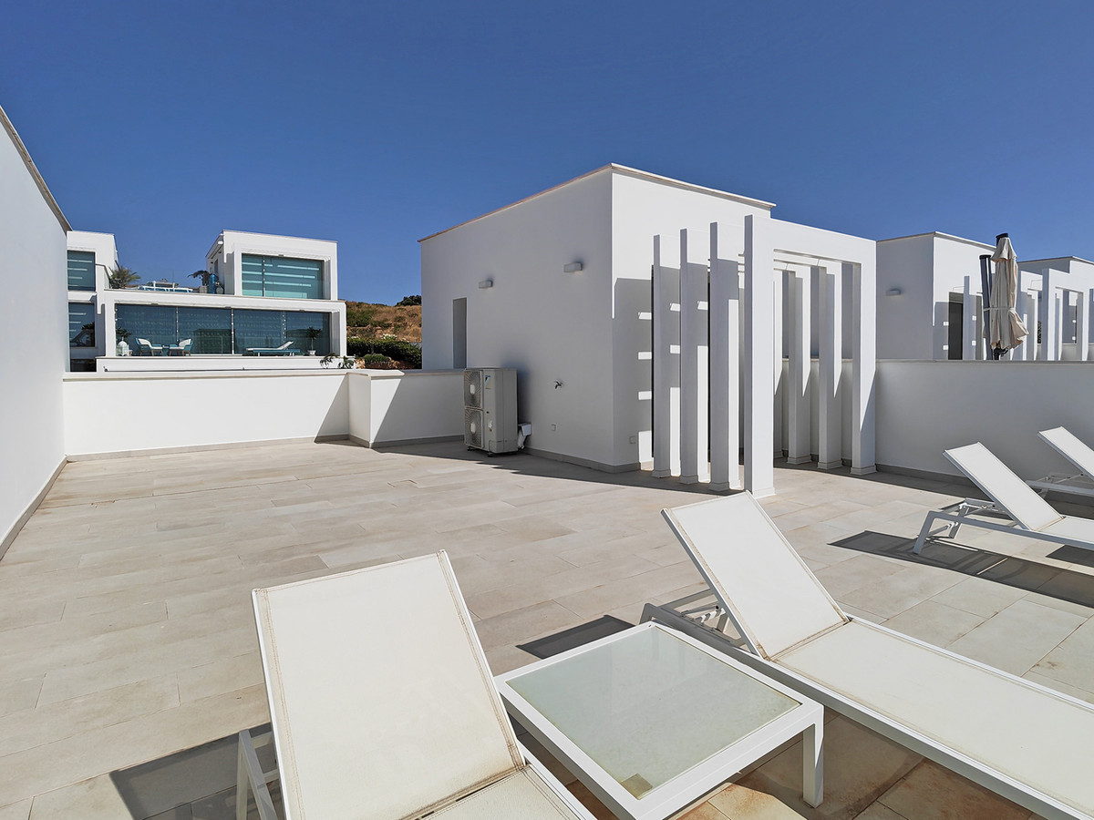 It is light and bright through out with an open plan design , including living room with modern fireplace and large windows that open out onto the terrace area, contemporary kitchen with modern appliances , three bedrooms with modern bathrooms and a large solarium/sun terrace with fabulous sea views , and private garden .